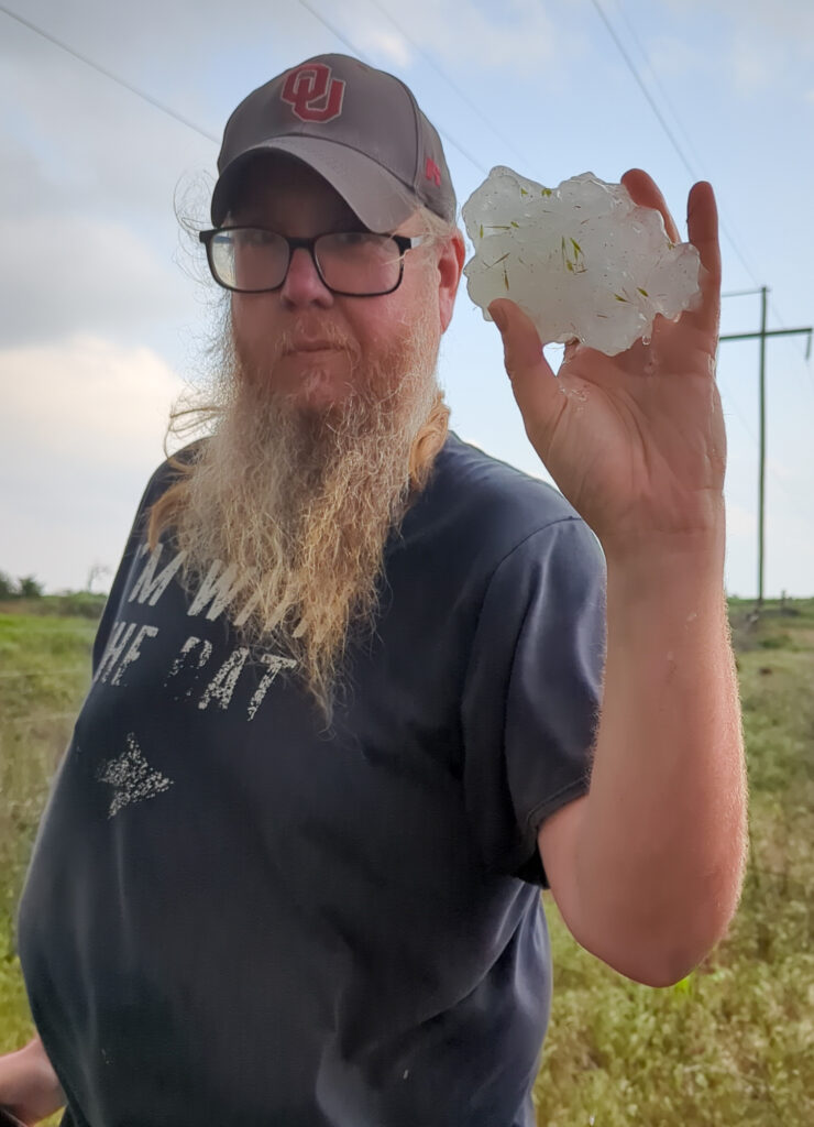 We pulled off onto the dirt roads north of Arnett where we quickly ran into some gigantic hailstones laying on the ground.