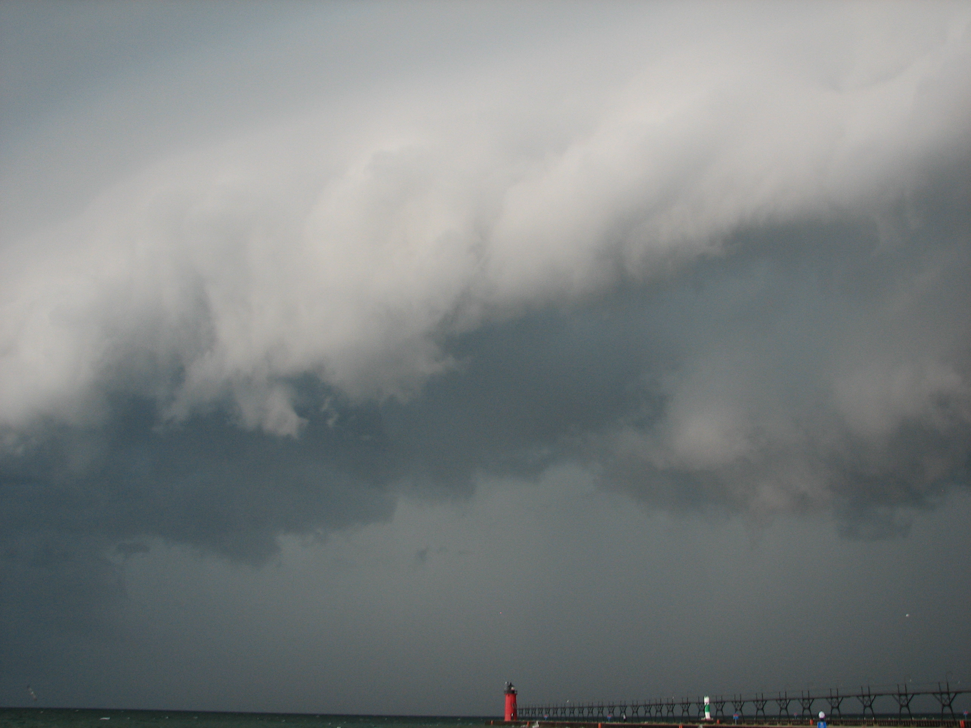 I flew up I-94 and I-196 to South Haven, where I parked and got some AMAZING shelf cloud pictures as the storm came ashore. The people playing volleyball on the beach continued to play as this was all going on, with multiple cloud to ground strikes over the water.